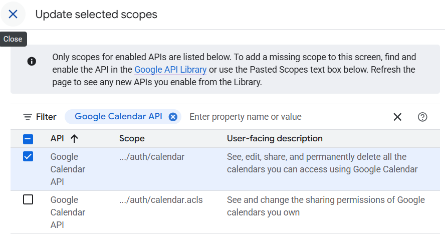 Add only the Google Calendar API with the …auth/calendar scope, and use the search filter to search for “Calendar”.