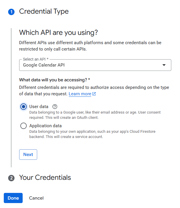 Select the Google Calendar API from the Select an API dropdown. A set of radio buttons will appear; click on the User data option. Click Next.