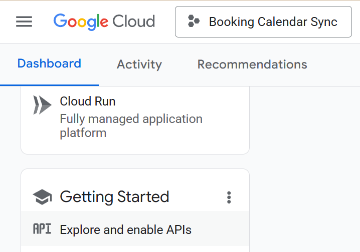 If you see this screen after starting a new project, click on the Explore and enable APIs option under the Getting Started section.