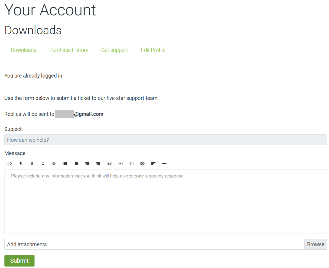 An account will get created for you after your plugin purchase or free download; this is the place you can access things such as your plugin zip files, license keys, and support tickets.